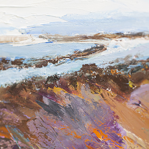 The Cornish coast is always full of surprises. When I paint in Cornwall, I like to find a quiet if not deserted cove and sit there for a while before I put brush to board, taking in natures palette of colours around me. For this piece I added chalky tones to warm up the craggy features of the cliffs as the sea made its way into the shore through a small inlet.
