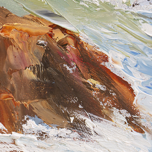 The foam like horses racing from the ocean onto the sea-soaked rocks creates a dramatic intensity of colours on land, sea, and sky. The oceanic sprays meld with the coastal terrain to create this inspiring colour palette.